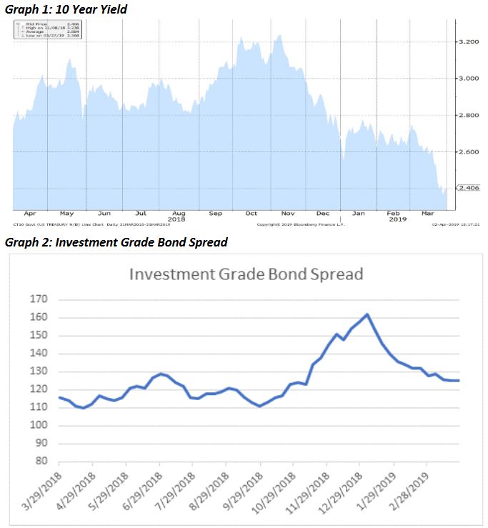 - Concerns about long-term economic growth and inflation have caused bond investor’s flight-to-quality by adding longer-dated treasuries, therefore pushing down those yields. Such action, coupled with past fed rate hikes increasing yields on the front end of the treasury curve, caused the 10-year yield to dip below the 3-month yield late in March. This is the first occurrence of that inversion since mid-2007. In the past, such an inversion has been a reliable indicator of a recession. In fact, inversions of that spread have preceded each of the past seven recessions. This fear of a slowdown caused the 10-year yield to decrease 28bps to end the quarter at 2.41%, a steep reversal from the recent high of 3.24% on November 8th, 2018 (graph 1). Overseas investors, concerned by their countries prospects and low interest rates, have pushed into U.S. corporate debt which has helped fuel a rally in the asset class. Spread in investment grade bonds tightened by 32bps on the year (graph 2), reversing the risk-off widening seen in the fourth quarter of 2018.