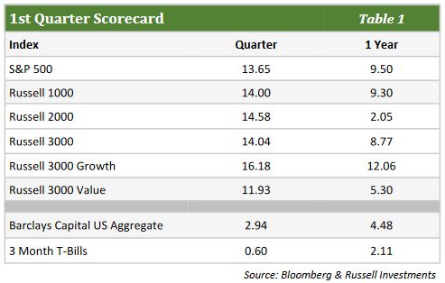 - The stock market celebrated the 10th anniversary of the current bull rally by charging 13.7% higher – its strongest quarterly performance since 2009 and the best first quarter gain for the S&P 500 since 1998.