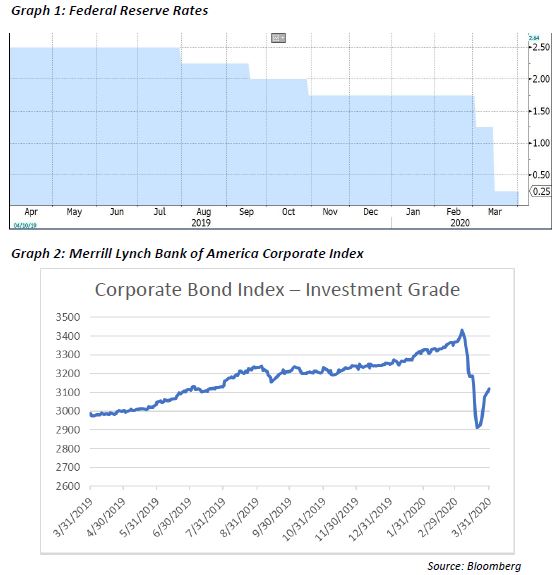 - The Federal Reserve first stepped up with an emergency rate cut of 50bps, followed quickly by another cut of 100bps only two weeks later (Graph 1). Those rate cuts were only the beginning of various Fed actions to ensure it does everything in its power to prevent a major credit crisis. Other steps taken include unlimited Treasury and MBS buying, two lending facilities to large companies, the ability to purchase corporate bonds and ETFs, Commercial Paper/Loan facility expansion, and an expected lending facility for small businesses. These monetary policy actions are in addition to the fiscal policy stimulus package of $2 trillion to help keep the economy afloat.