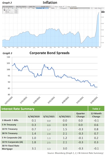 • Coming off a historically poor 1st quarter of performance, the Barclays Aggregate bounced back with a return of +1.67%. The inflation story continues to drive the markets as questions linger over whether the current measures will prove to be transitory or longer lasting (Graph2).