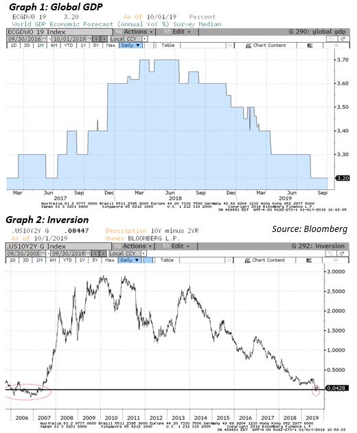 - Throughout the 3rd quarter, investors showed signs of growing increasingly fearful of a global recession. Economies are slowing around the world, buoyed by the uncertainty amid escalating trade tensions. Global Central Banks have been taking actions to loosen monetary policy in an attempt to stave off recessions, but a low growth environment appears to be the base case scenario going forward (graph 1).