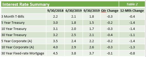 - Despite a more modest gain during the quarter, the S&P 500 is still up an impressive 18.7% year to date, suggesting that investors continue to have optimism regarding the future of the economy heading into the final months of 2019.
