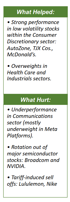 The preference for stocks with low price volatility paid off particularly in the Consumer Discretionary sector where stocks such as AutoZone, TJX Companies, and McDonald’s produced positive returns. Overweights in the more attractively valued sectors of Health Care and Industrials magnified the effect of outperformance in those stocks. Cboe Global Markets was a significant contributor in the Financial sector as demand for the largest operator of options exchanges tends to increase in heightened periods of market volatility.