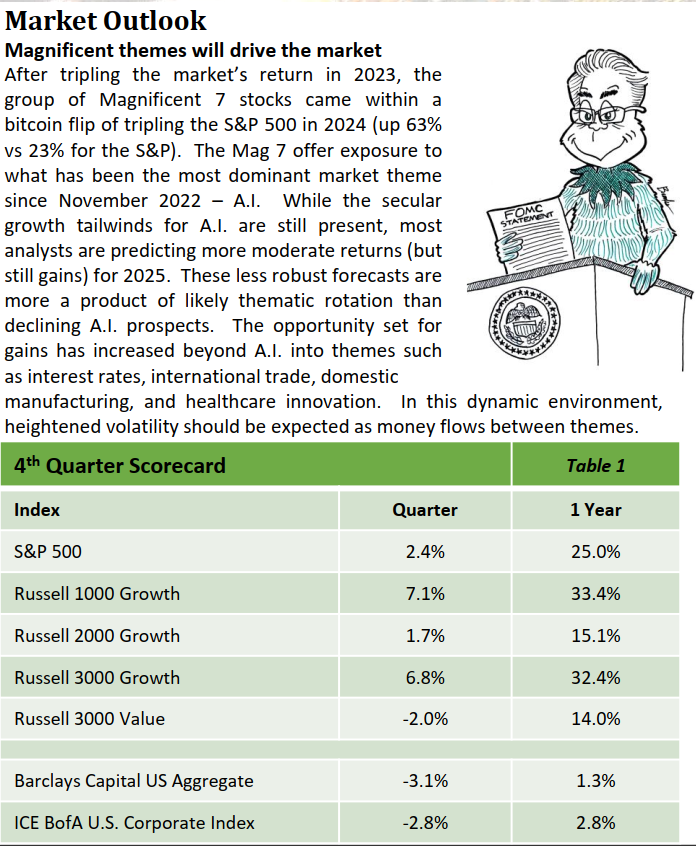 After tripling the market’s return in 2023, the group of Magnificent 7 stocks came within a bitcoin flip of tripling the S&P 500 in 2024 (up 63% vs 23% for the S&P). The Mag 7 offer exposure to what has been the most dominant market theme since November 2022 – A.I. While the secular growth tailwinds for A.I. are still present, most analysts are predicting more moderate returns (but still gains) for 2025. These less robust forecasts are more a product of likely thematic rotation than declining A.I. prospects. The opportunity set for gains has increased beyond A.I. into themes such as interest rates, international trade, domestic manufacturing, and healthcare innovation. In this dynamic environment, heightened volatility should be expected as money flows between themes..